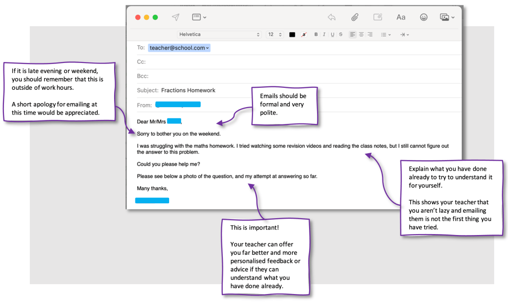 - Be clear – attach a photo of your work, or a screenshot of a specific question you don’t understand. Your teacher cannot respond to vague emails which don’t ask clear questions in context.